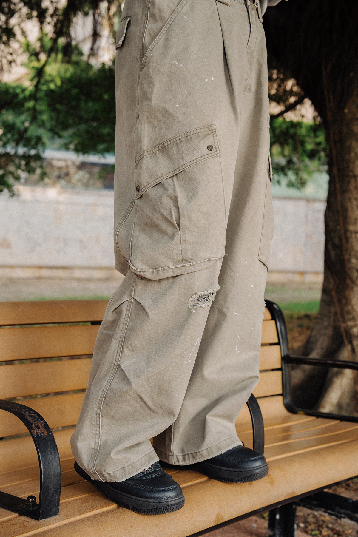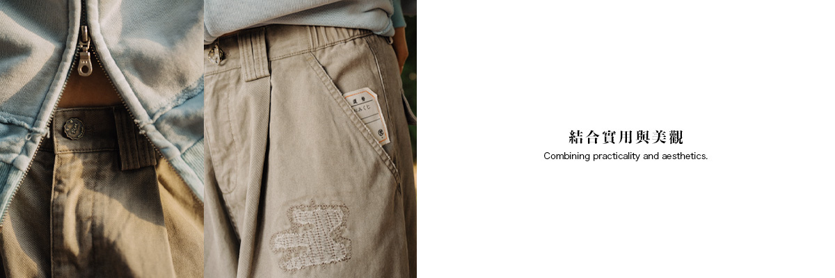 洗水碧紋布斜袋闊褲設計靈感源於工裝,加上採用洗水碧紋布(310g),展現堅韌與耐磨的特性,卻又不失休閒的隨性。利用直筒闊腳版型能提供舒適的穿著體驗外,同時為整個隨性的穿著感覺加強視覺效果。