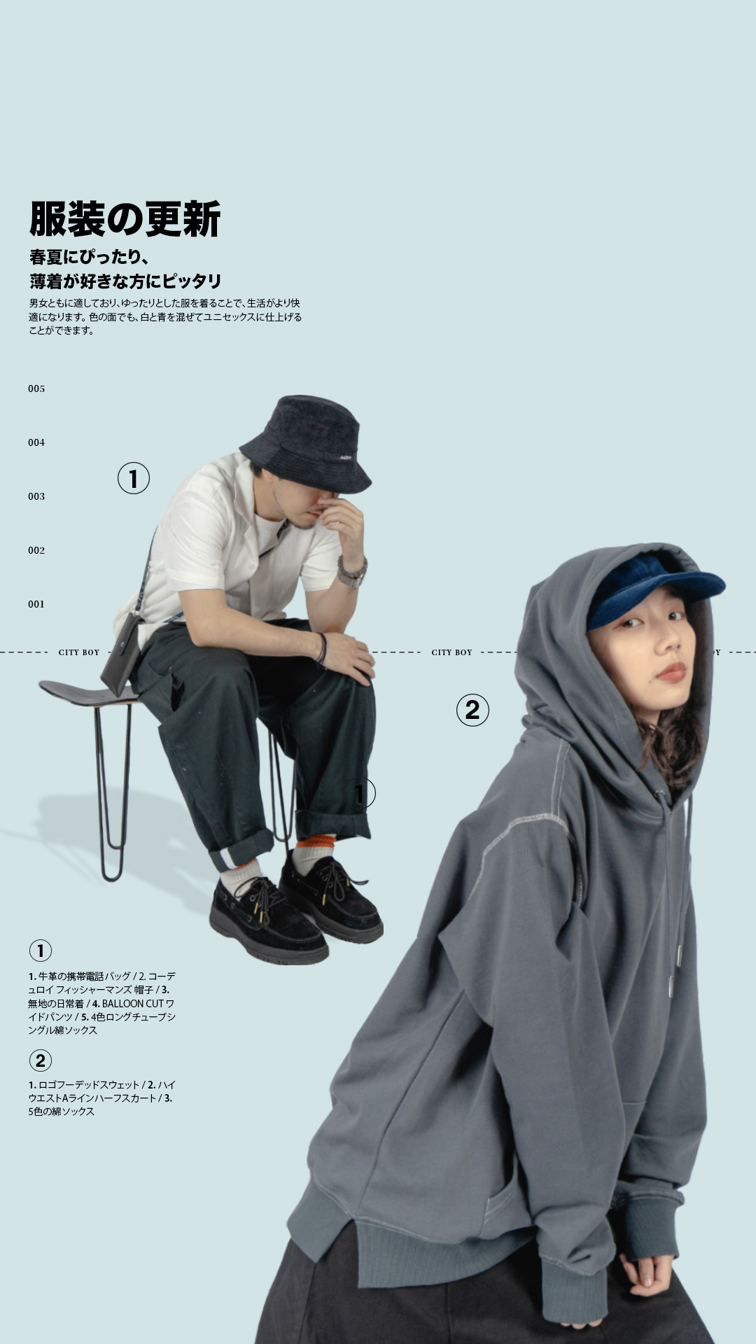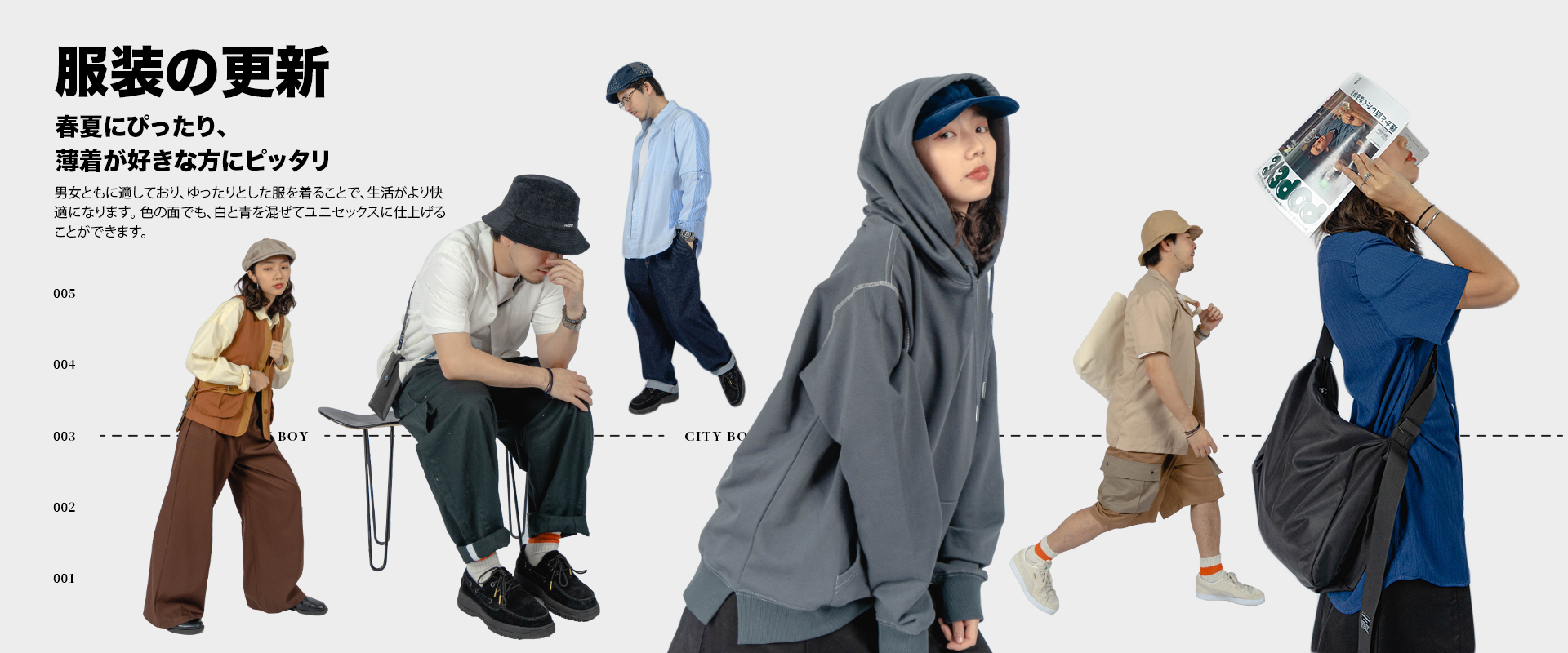 從舒適衣履中展現真我,以簡約寬鬆、層次變化、混搭風格三大元素呈現CITY BOY的穿搭哲學。