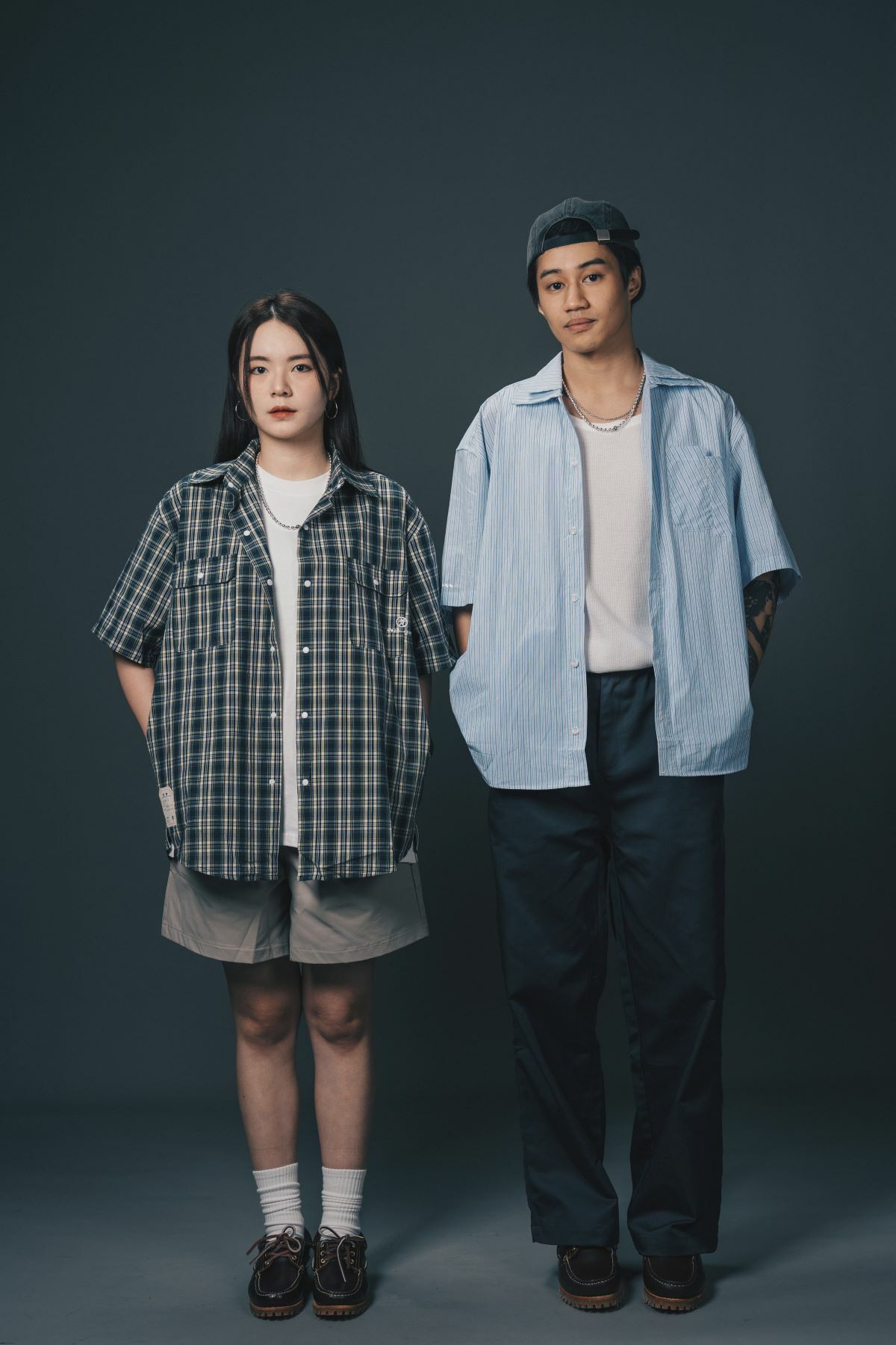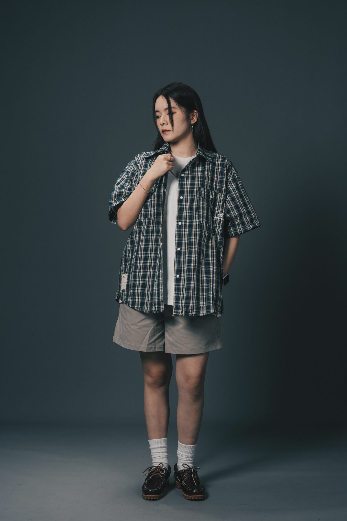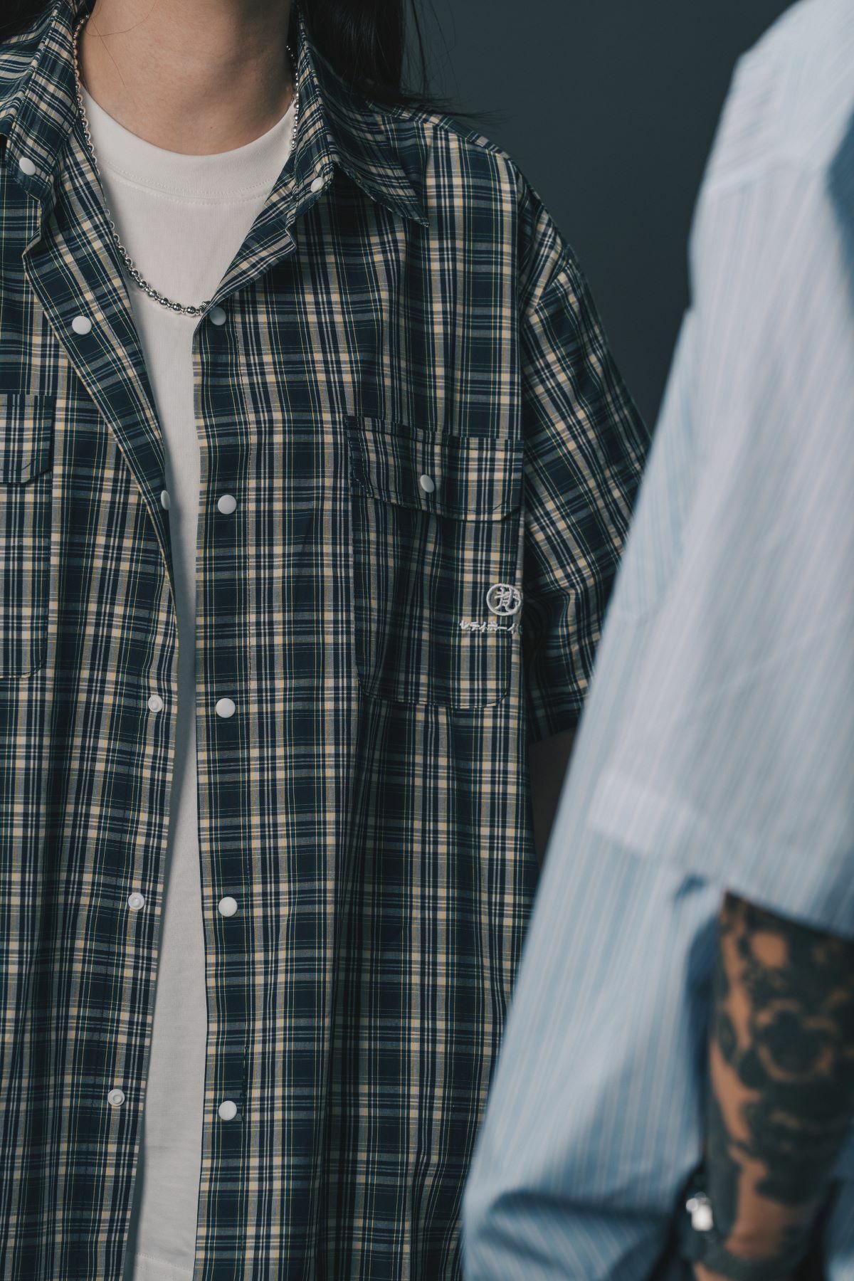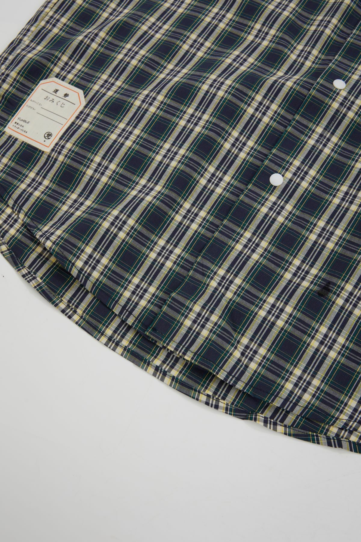The shirt is designed with matte snap buttons and includes functional pockets on both sides, making it as practical as it is stylish. The signature good luck woven label adds a touch of fun to the overall design. With a pleated back and side slits, this shirt provides flexibility and ease of movement. Additionally, the back features a hanging loop for convenient storage.
