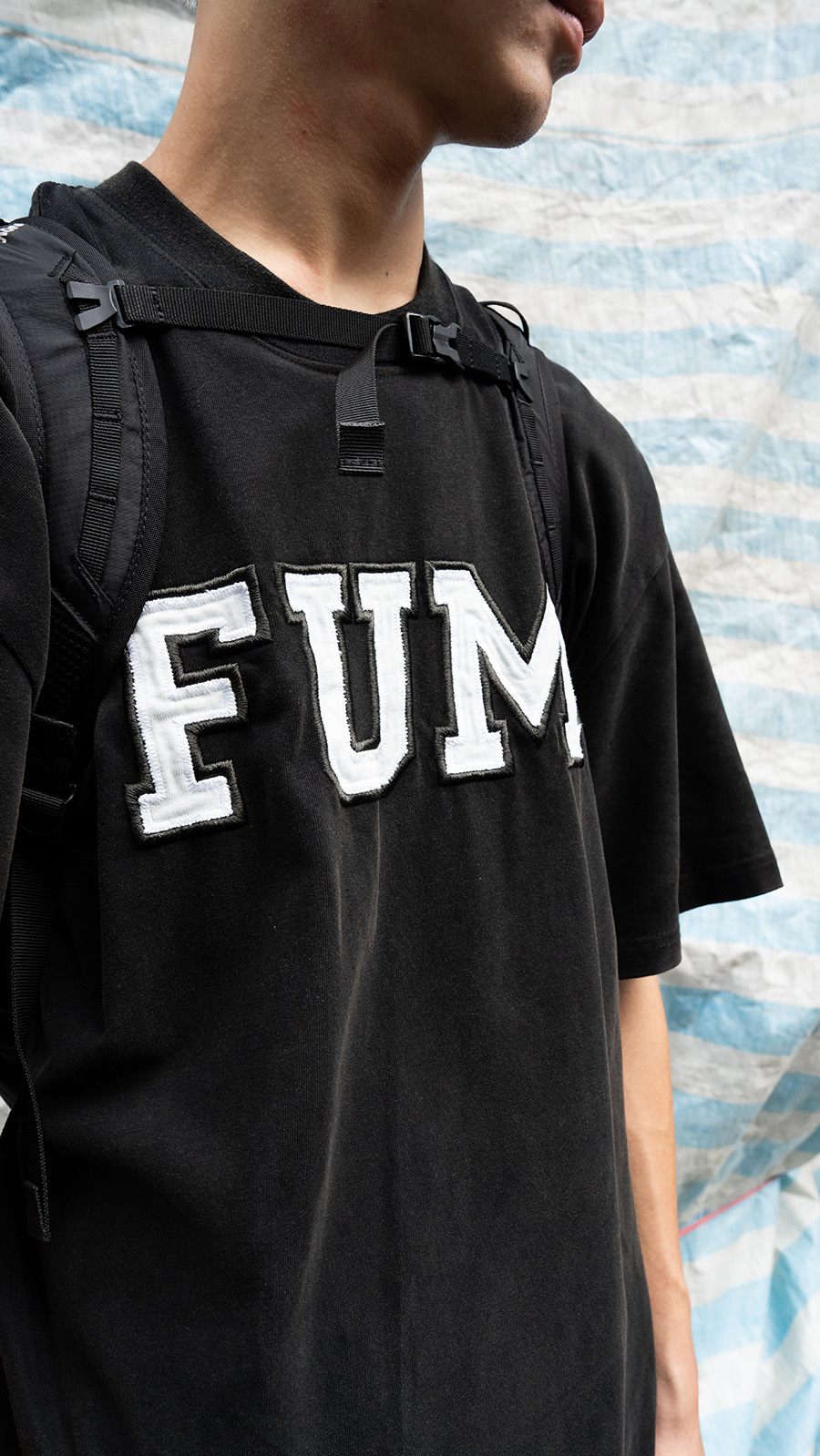 The three letters “FUM” are reimagined through heavyweight quilting embroidery,