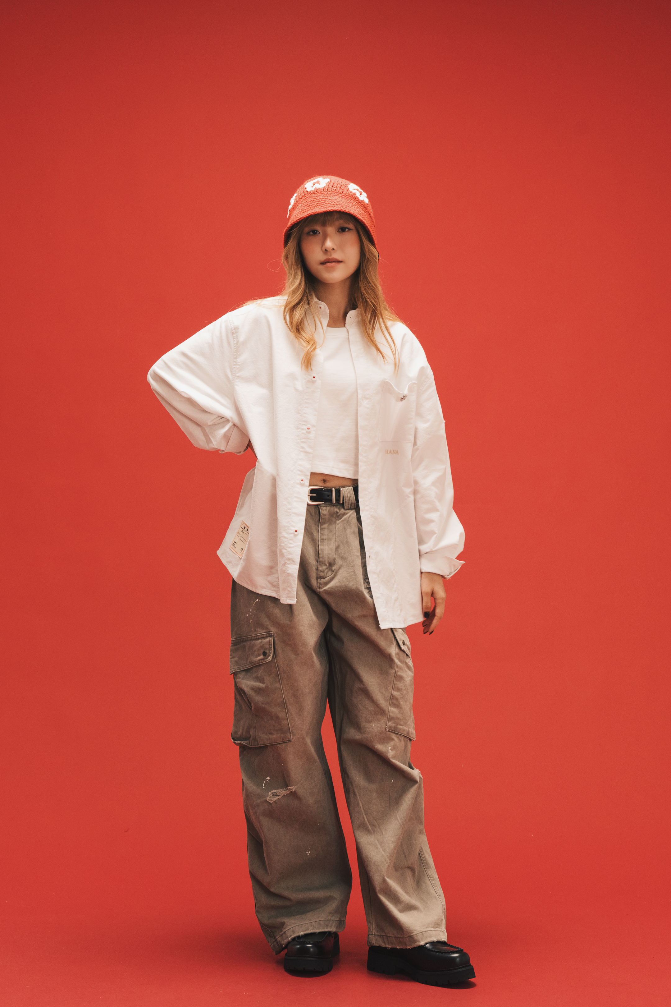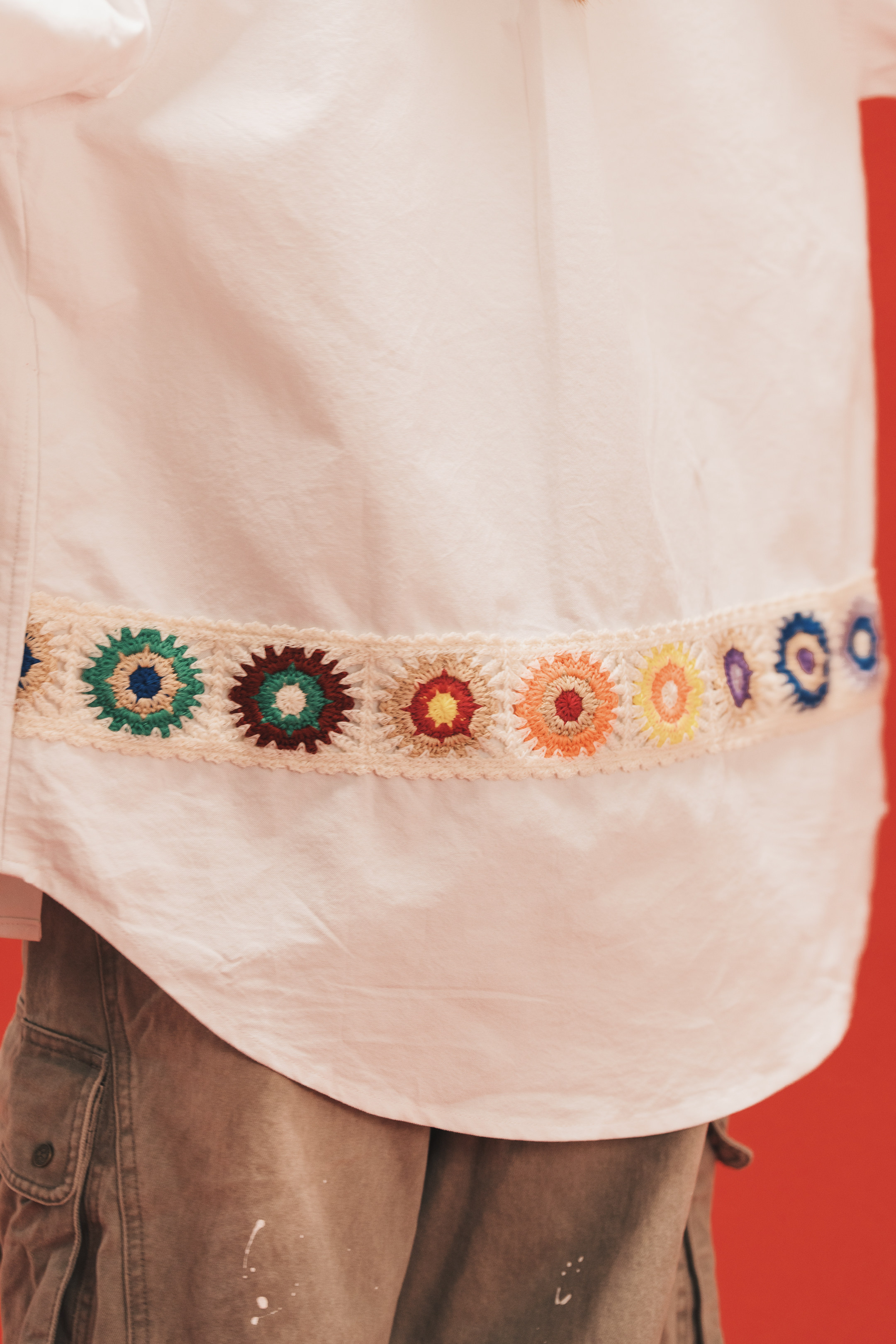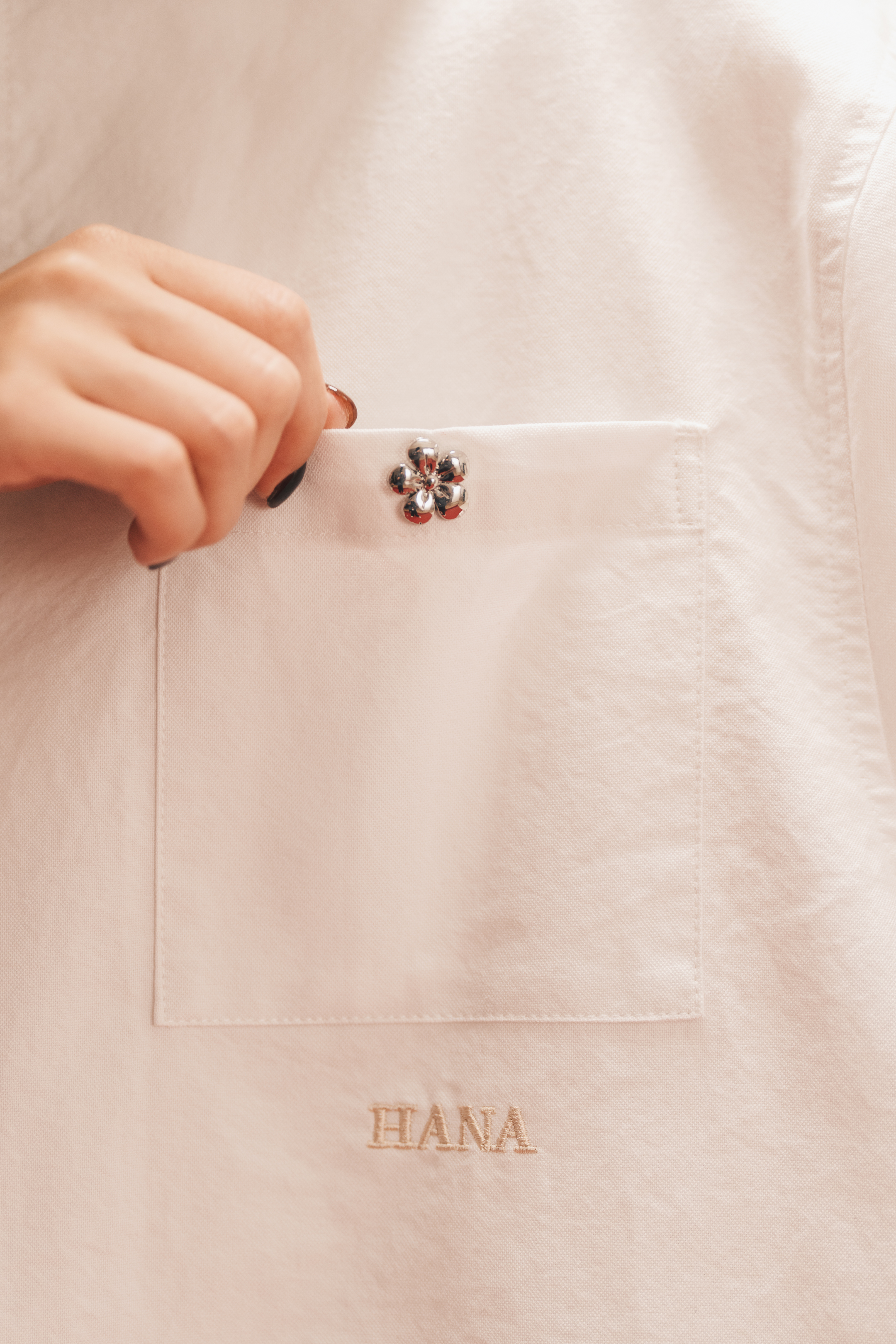 Using pure white Oxford cloth as a canvas, this shirt lets HANA’s quiet poetry bloom in the everyday.