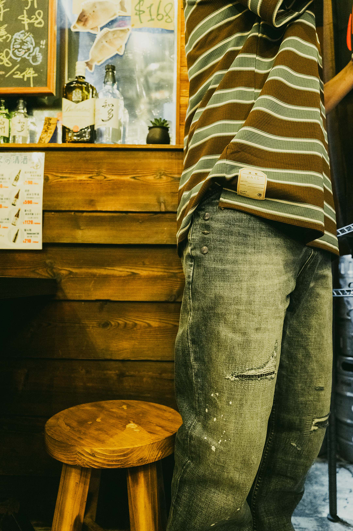 The leg lines are relatively visible, and they are washed and processed to create an aged effect.