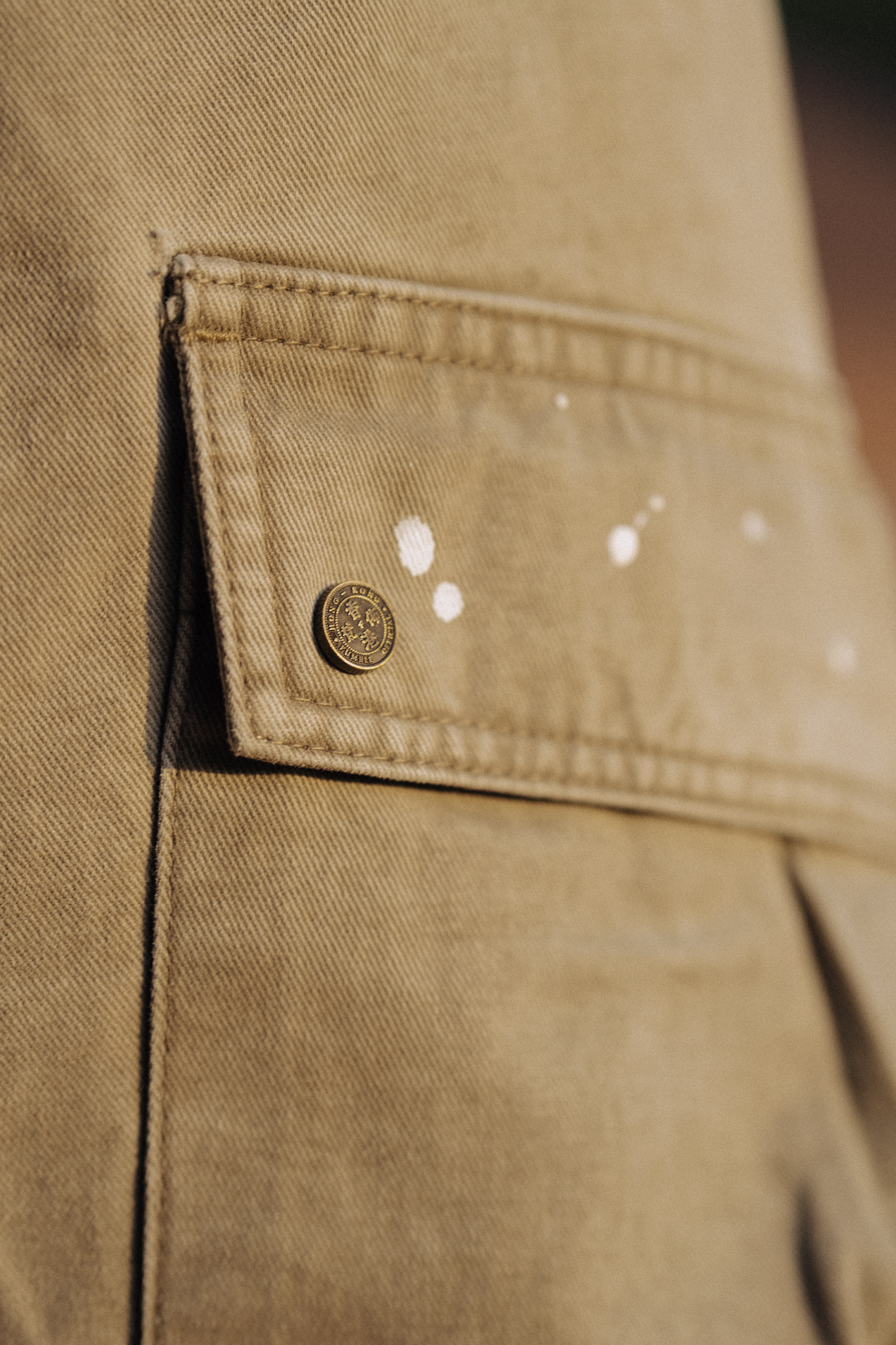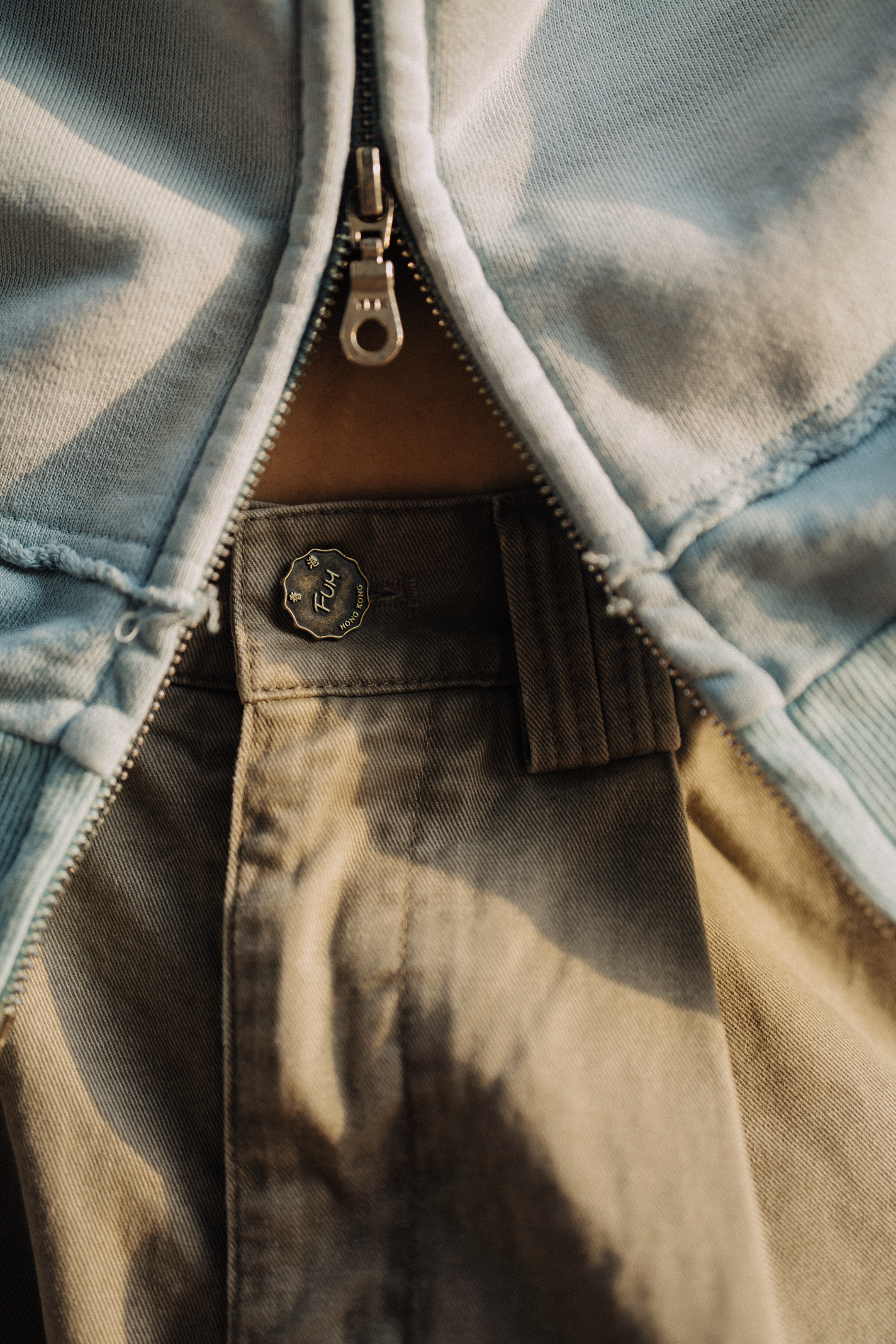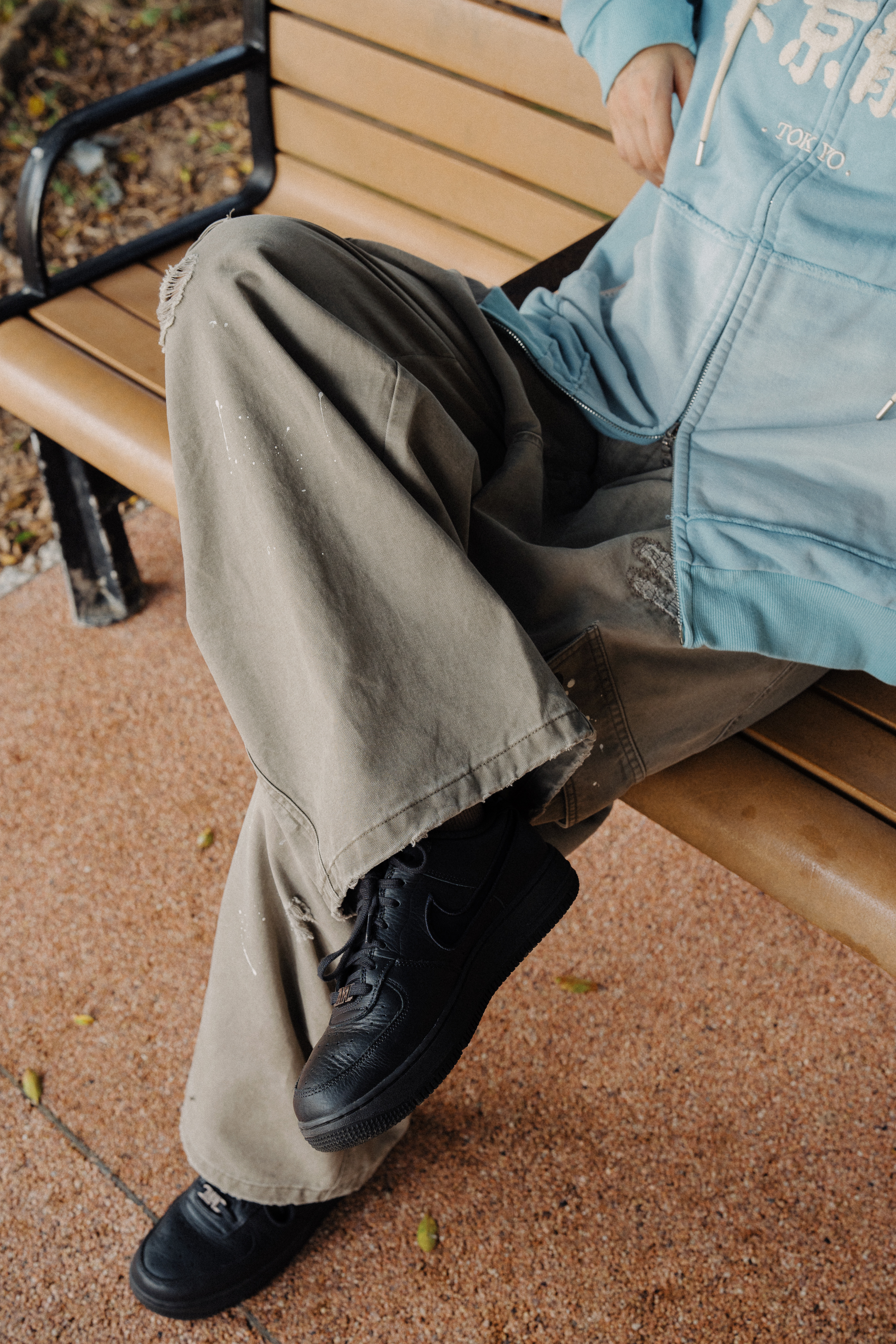 The design of the washed blue pattern trousers with diagonal pockets is inspired by workwear, and is made of washed blue pattern fabric (310g), showing toughness and wear-resistance, yet still being casual and casual. The straight and wide-leg version can not only provide a comfortable wearing experience, but also enhance the visual effect of the entire casual wearing feeling.