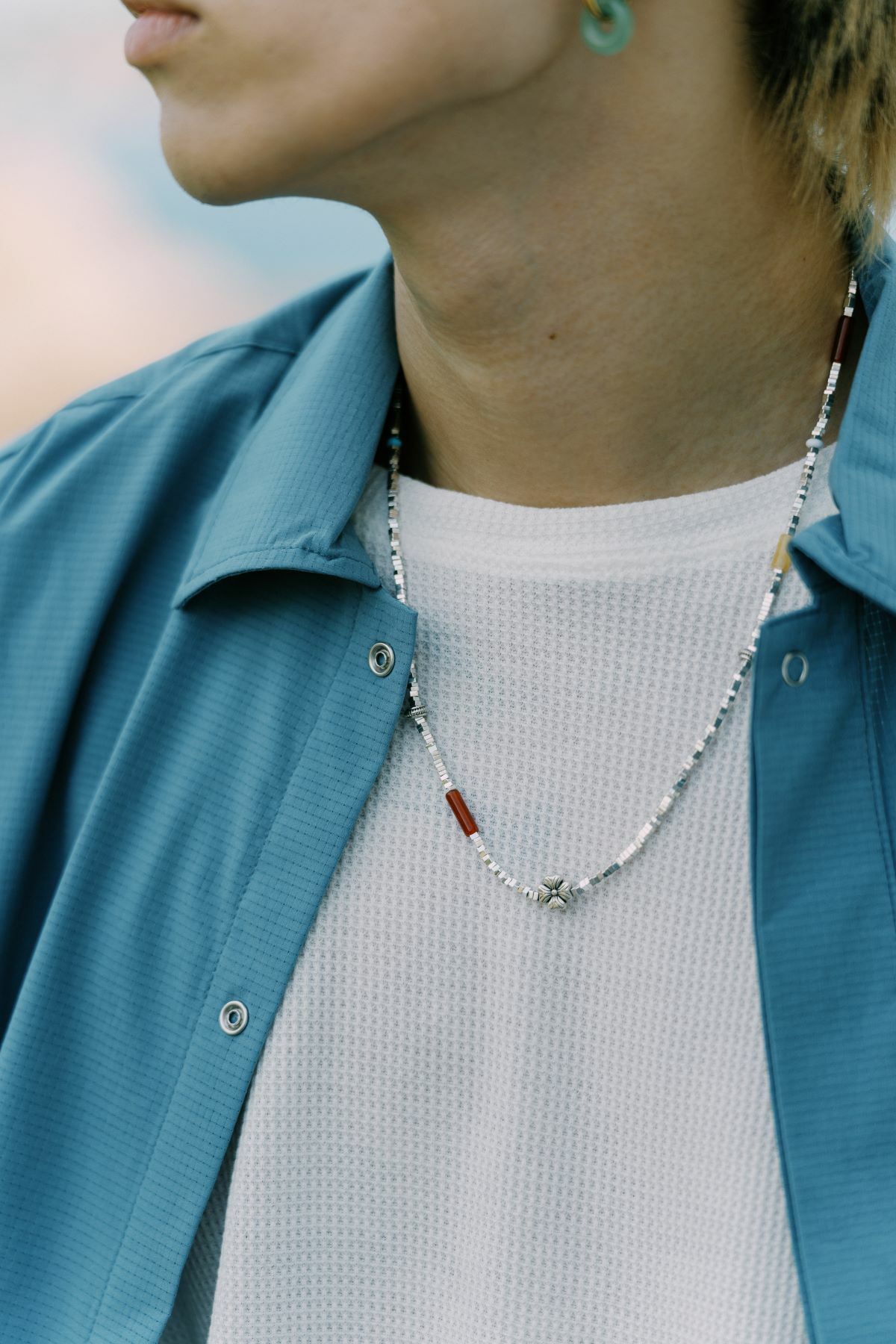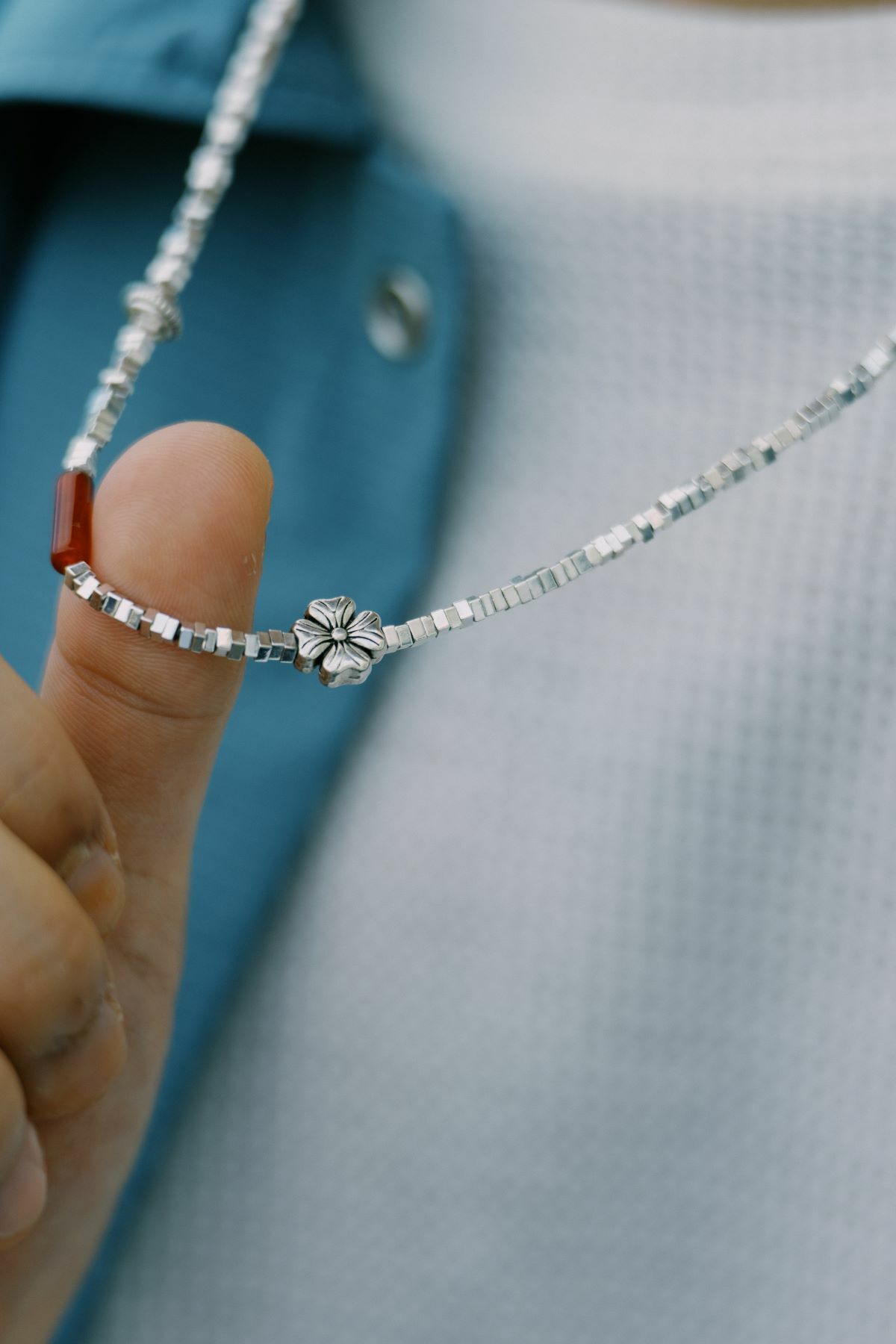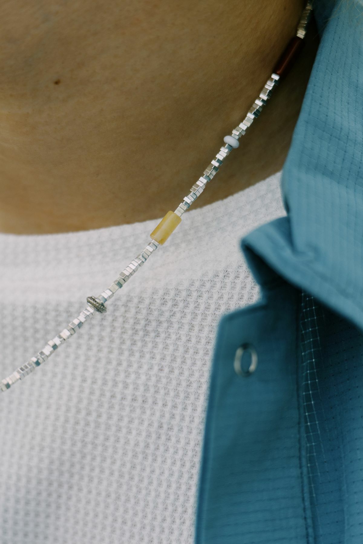 Named the Shattered Silver Bead Necklace, this piece is more than just a necklace—it's also a bracelet. Embracing FUMBLE's spirit of exploration, the design offers an unexpected versatility.