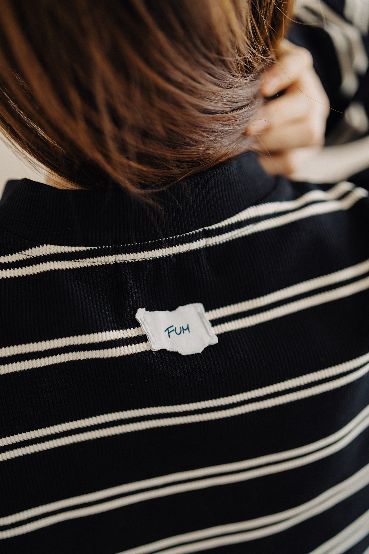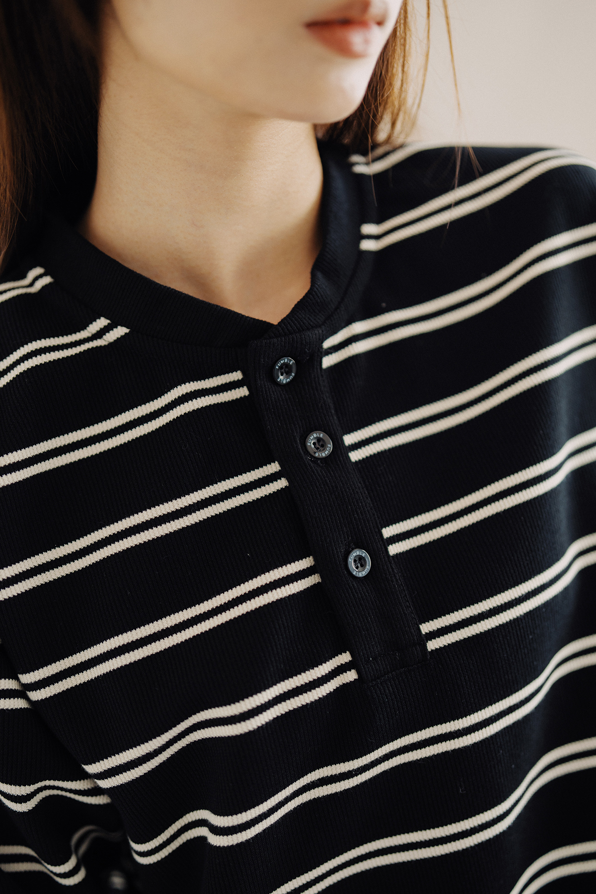Striped Waffle Long Sleeve Henley Tee|Black|Hong Kong Original Design
