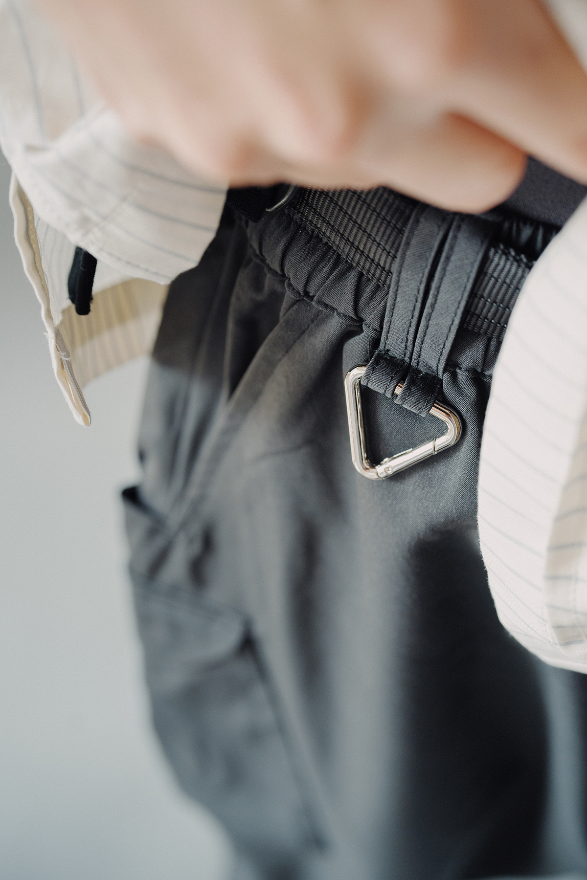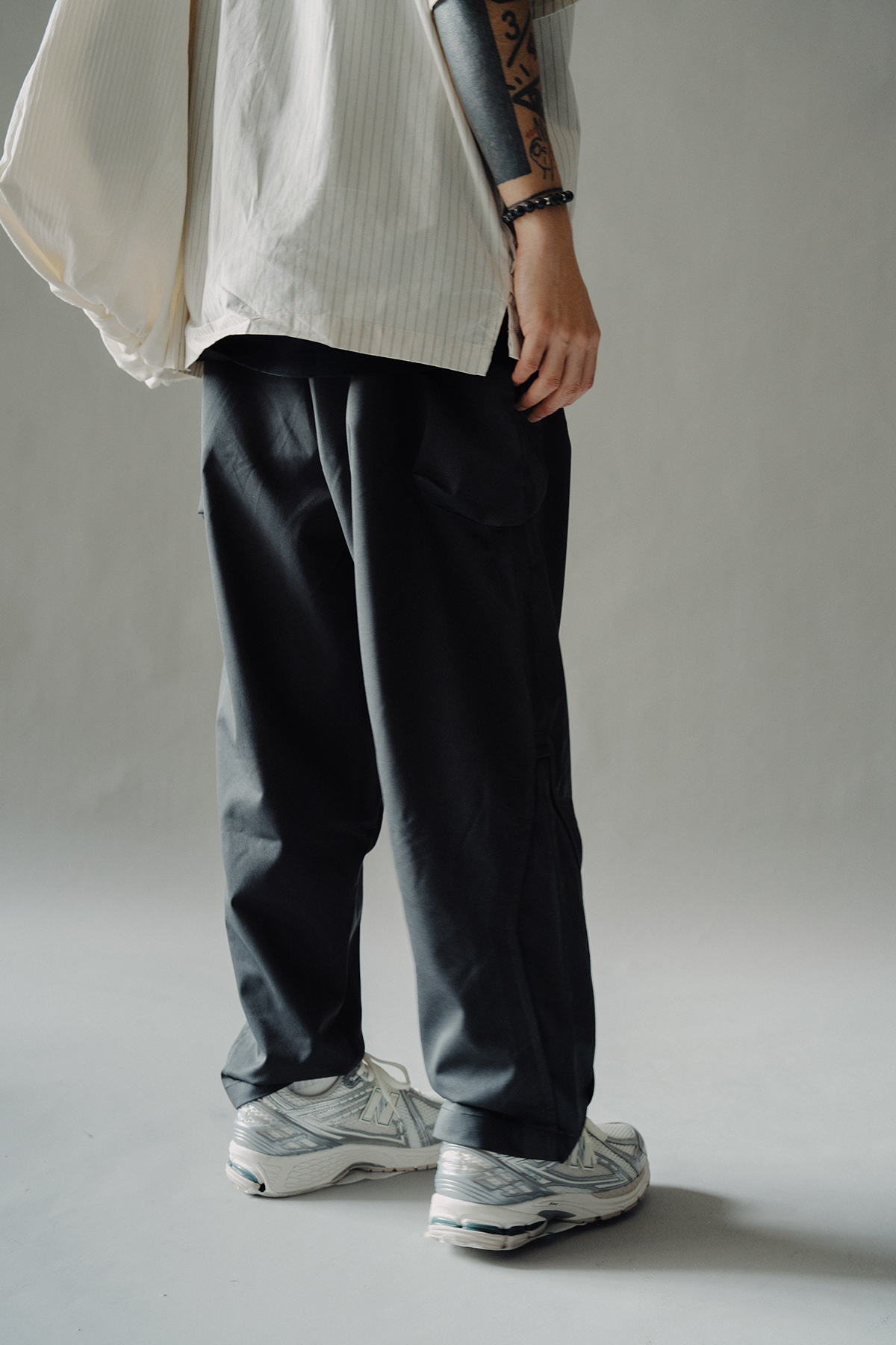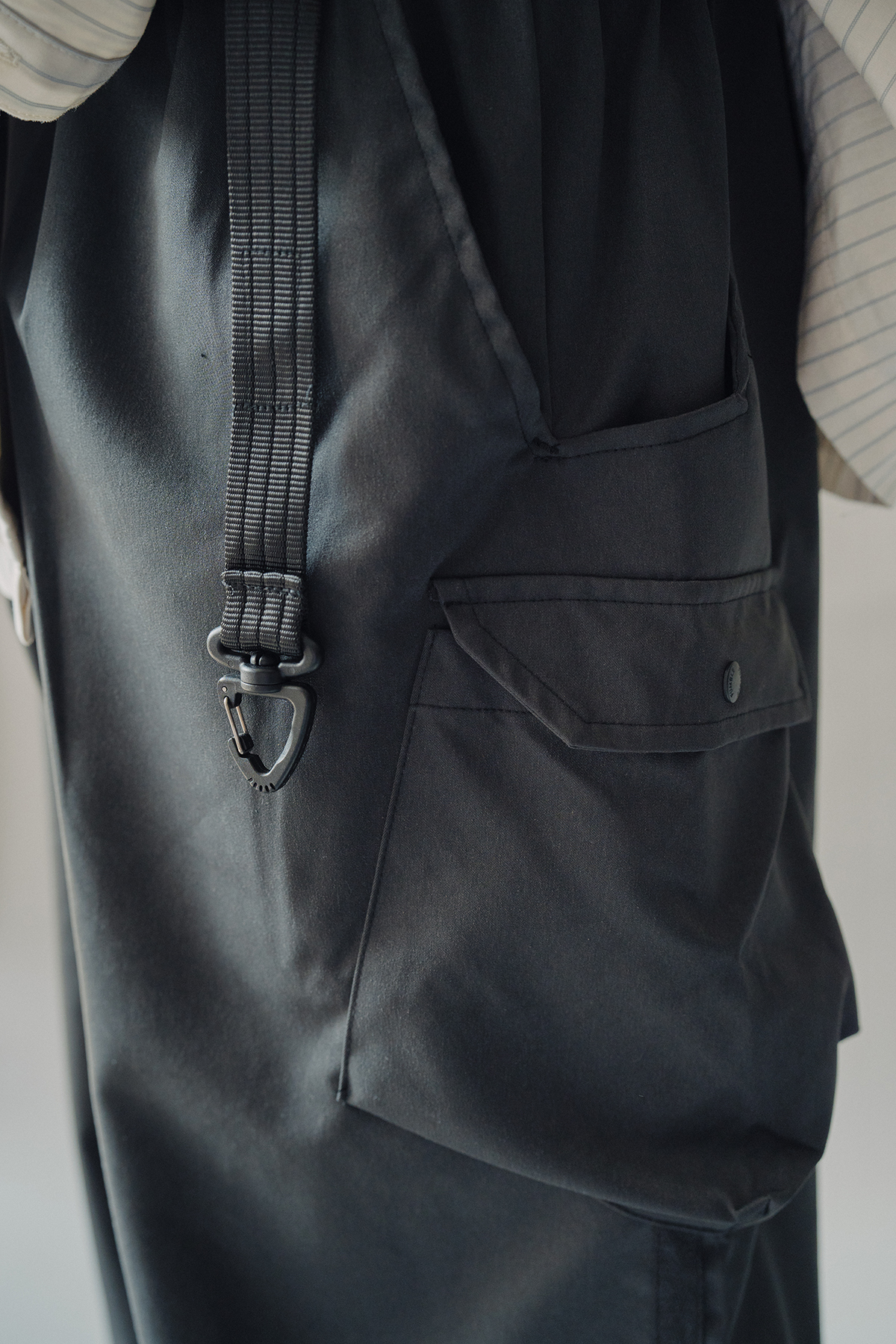 The trousers are designed with slightly wider thighs and trimmed legs, combined with webbing, unique tailoring lines and high-storage semi-stereo bags.